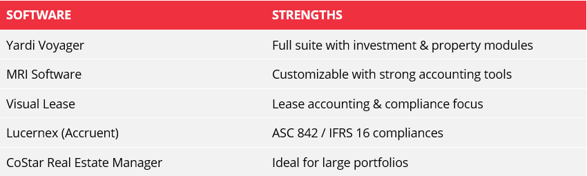 REITs typically require scalable, audit-compliant, and integration-ready software tools. Common platforms include: